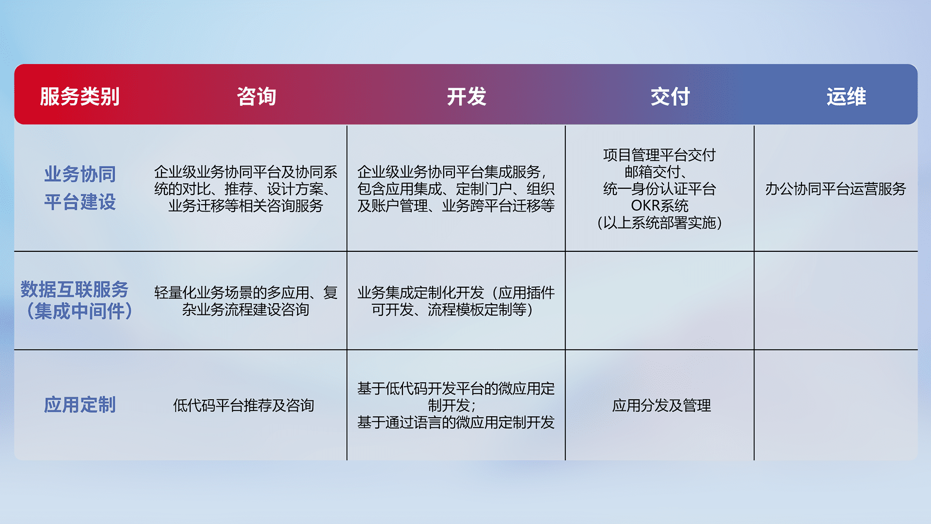 针对钉钉、、、、企微、、、、IDaas等平台级产品提供产品的规划、、、、方案、、、、交付、、、定制化开发等服务,,,实现如统一协同办公、、、智能客户服务、、、混合会议管理、、、、智能数据查询、、等业务场景,,,实现数字化转型。。。。
